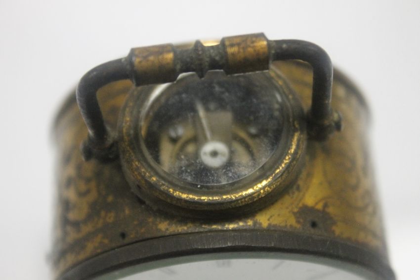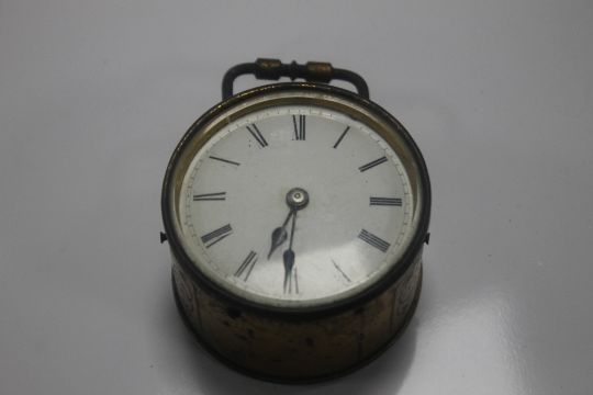 A SMALL 19TH CENTURY DRUM CARRIAGE CLOCK WITH LEVER ESCAPEMENT WINDOW AND WHITE ENAMEL DIAL, D 6 CM