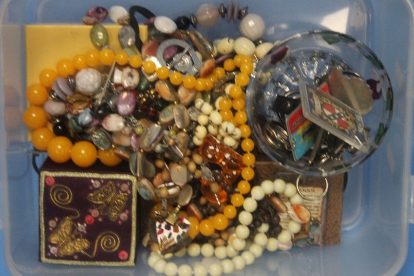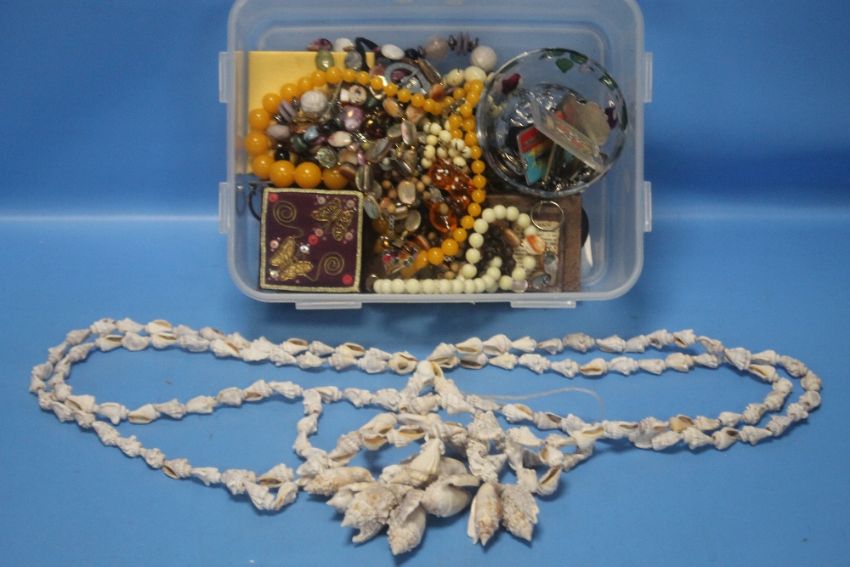 A COLLECTION OF COSTUME JEWELLERY TO INCLUDE A NECKLACE MADE FROM SEASHELLS