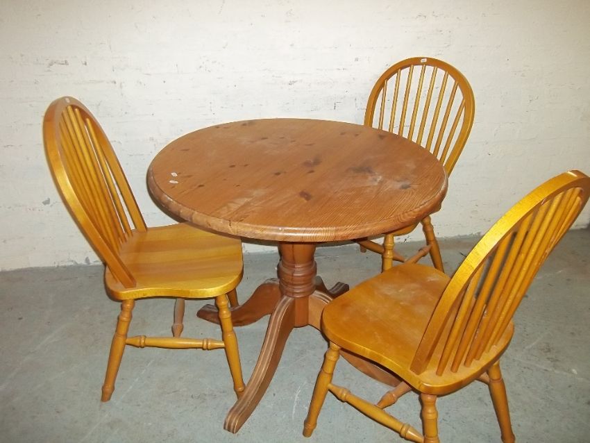 A SOLID PINE ROUND SINGLE PEDESTAL DINING TABLE SET WITH THREE CHAIRS