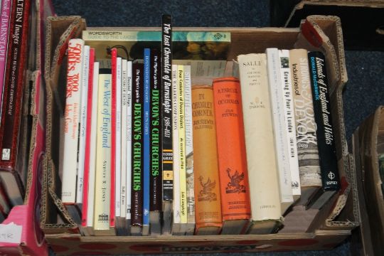 TWO TRAYS OF TOPOGRAPHICAL BOOKS MANY OF DEVON / SOUTH WEST INTEREST