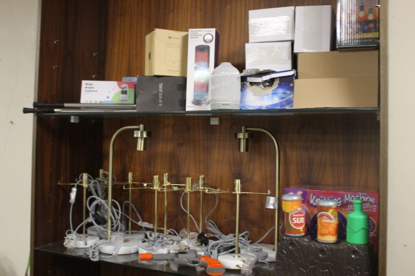 A QUANTITY OF ASSORTED ITEMS TO INCLUDE A QUANTITY OF LAMPS, CAMERA, COLOURFUL BULBS ETC.