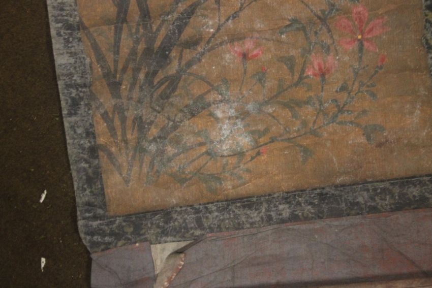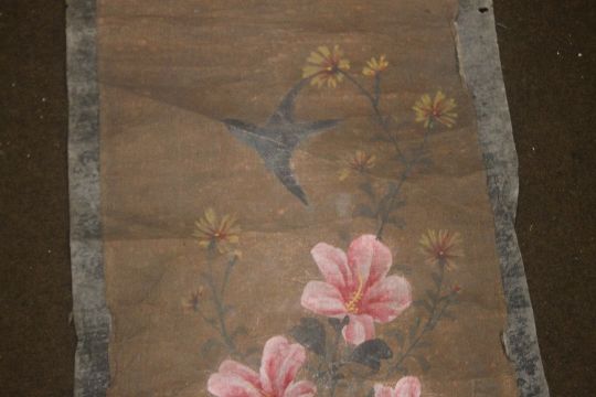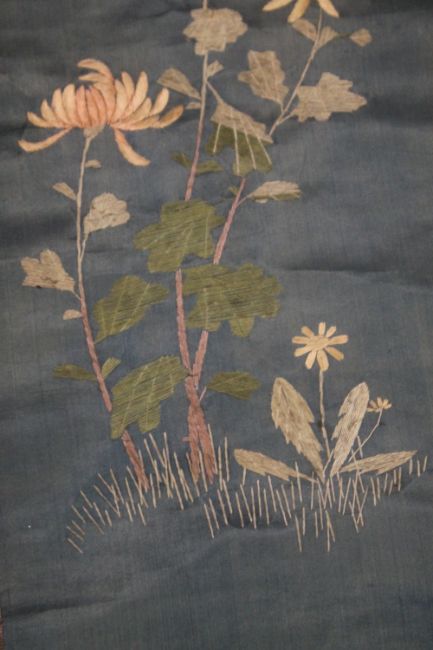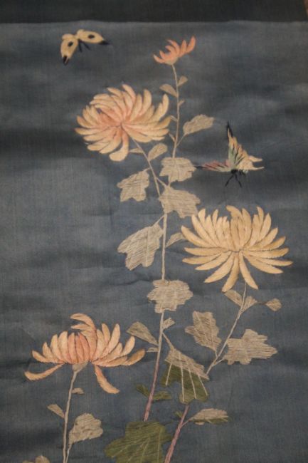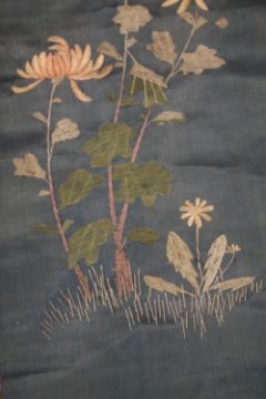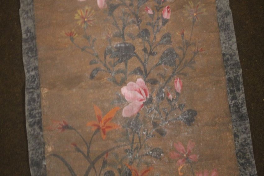 AN ORIENTAL SCROLL WITH EMBROIDERED DECORATION OF FLOWERS AND BUTTERFLIES, together with a painted example of flowers and a small embroidered panel