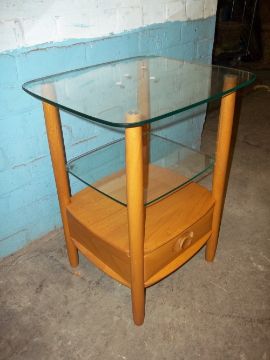 A BLONDE ERCOL GLASS TOPPED SIDE TABLE WITH DRAWER