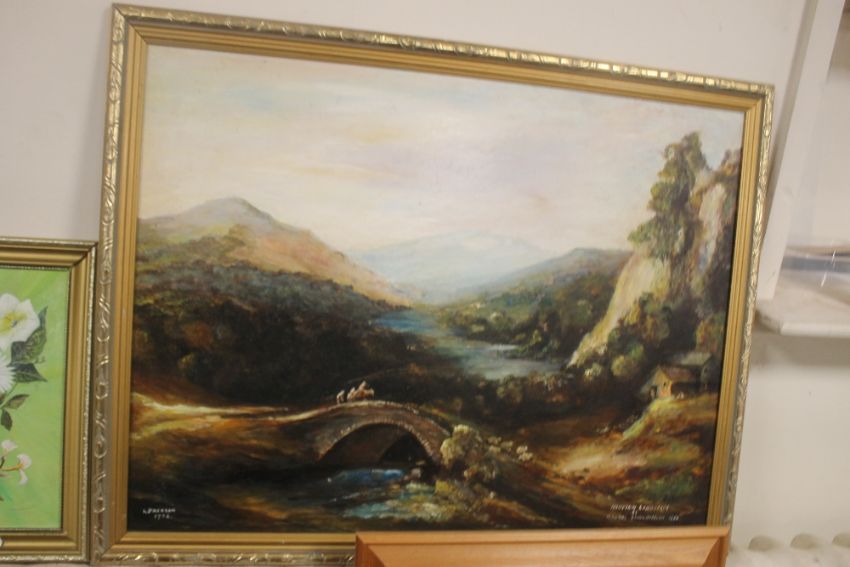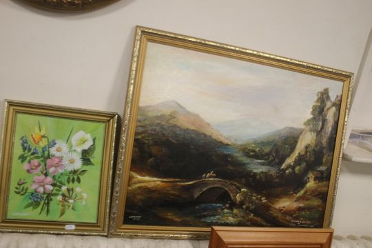 AN OIL PAINTING OF A BRIDGE OVER RIVER TOGETHER WITH A FLORAL STUDY (2)
