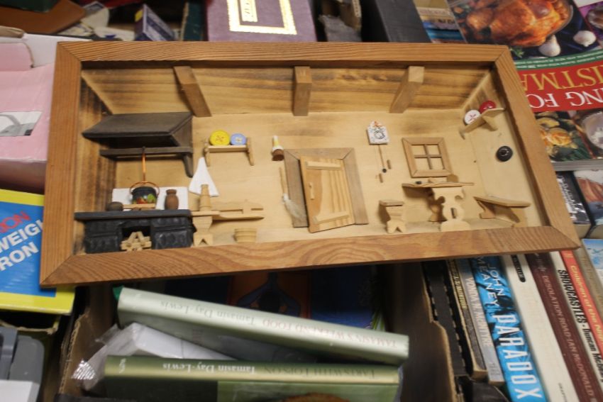 A SMALL BOX OF COOKERY BOOKS AND A FRAMED WOODEN KITCHEN SCENE