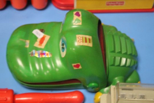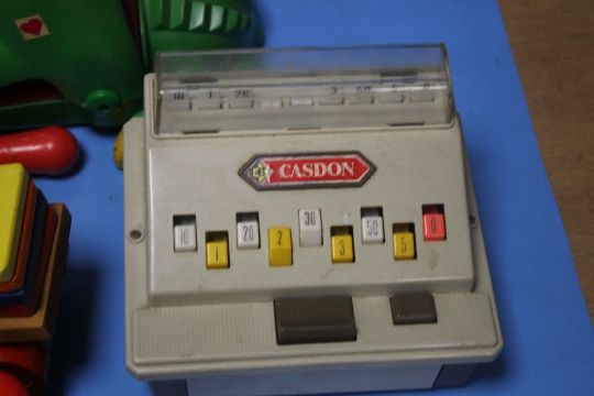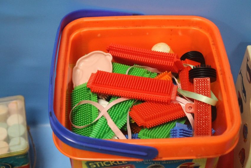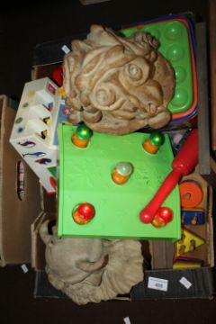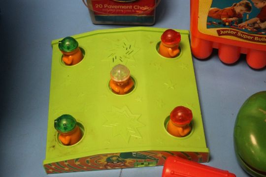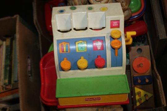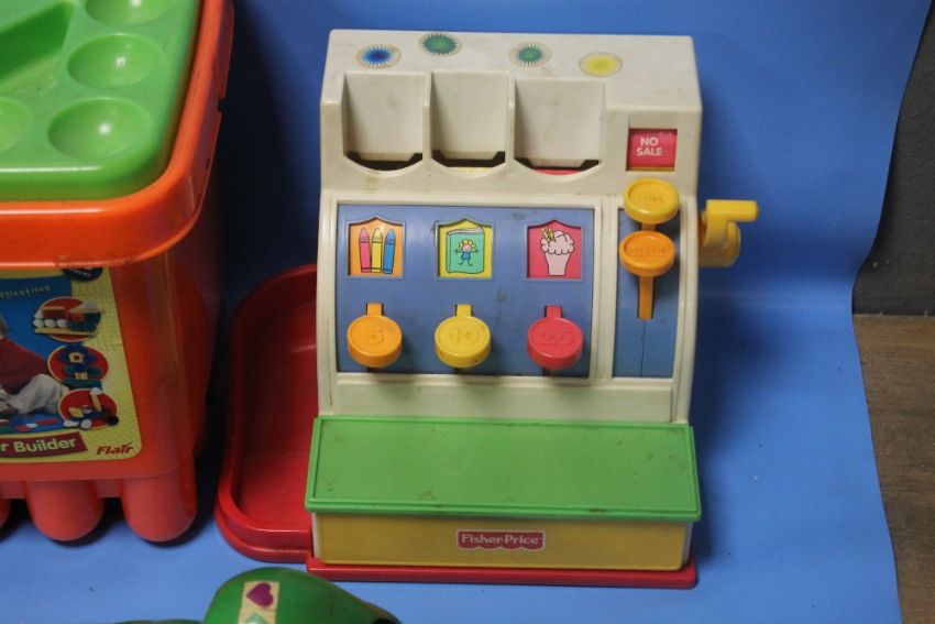 A TRAY OF CHILD'S TOYS TO INCLUDE CASH REGISTER, FISHER PRICE, STICKLEBRICKS ETC.