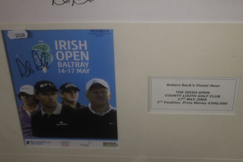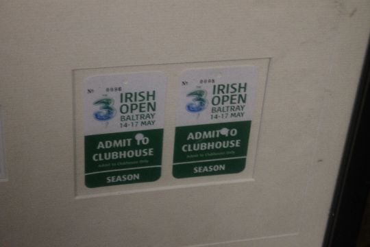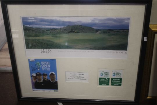 P. DAUBY, LIMITED EDITION PRINT ETC. "GOLF VIEW", IRISH OPEN, BALTRAY MAY SIGNED WITH GOLF MEMORABILIA WITHIN FRAME, 66 X 56 CM