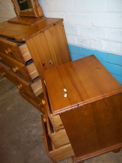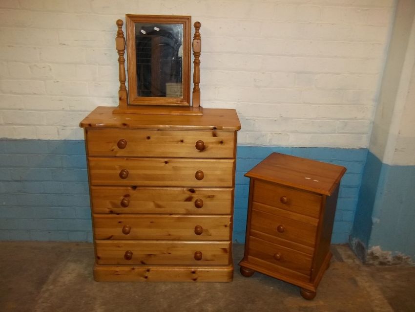 A MODERN SOLID PINE FIVE DRAWER CHEST AND A NARROW THREE DRAWER CHEST WITH A SWIVEL MIRROR