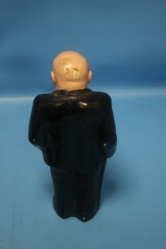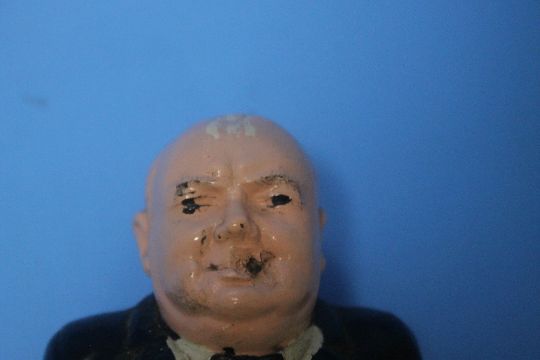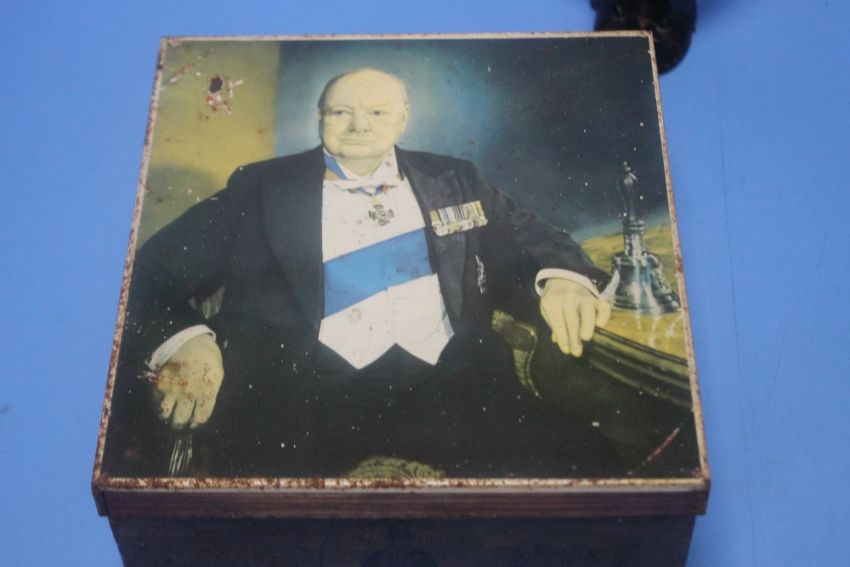 A WINSTON CHURCHILL FIGURE (NO MAKER'S MARK AND MISSING CIGAR) TOGETHER WITH A METAL TIN ALSO FEATURING WINSTON CHURCHILL