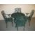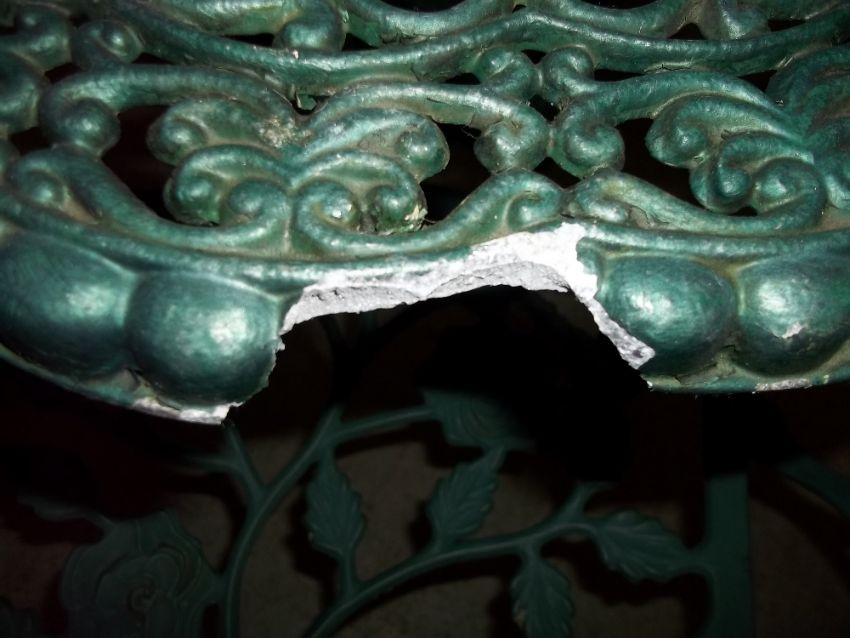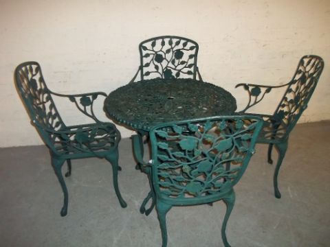 A CAST ALUMINIUM PATIO / GARDEN TABLE AND FOUR CHAIR SET A/F - ONE ARM MISSING AND DAMAGE TO TABLE TOP