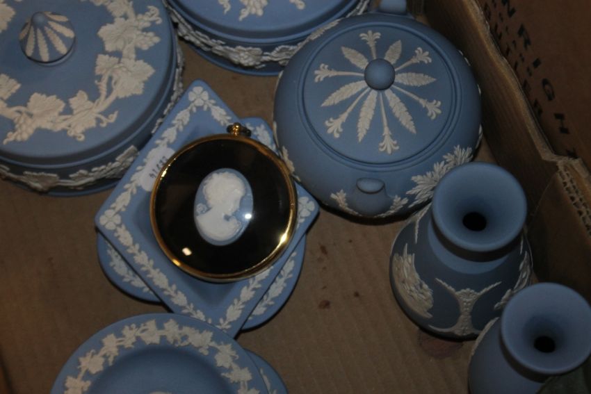 A TRAY OF BLUE & WHITE JASPERWAREPair of lidded bowls D 12 cm, both are in good condition with no chips or cracks that we can seeClassical lidded bowl D 11 cm with no chips or cracks that we can find