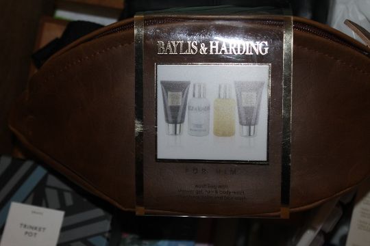 A BOX OF SUNDRIES TO INCLUDE PHOTO ALBUM, TRINKET BOX, BAYLISS & HARDING GIFT SET, SCENTED CANDLES ETC.