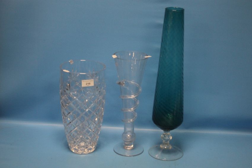 A HEAVY CUT GLASS VASE, A TALL TWISTED STEM VASE AND A TALL BLUE GLASS VASE (3)