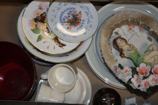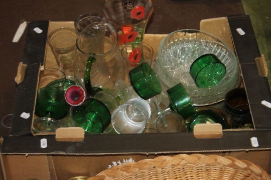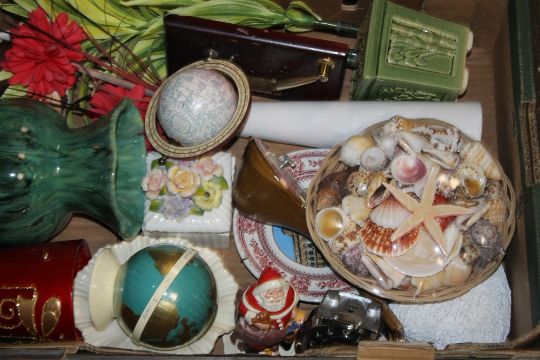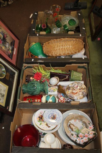 FOUR BOXES OF SUNDRIES INCLUDING GLASS, CHINA, ORNAMENTS ETC.