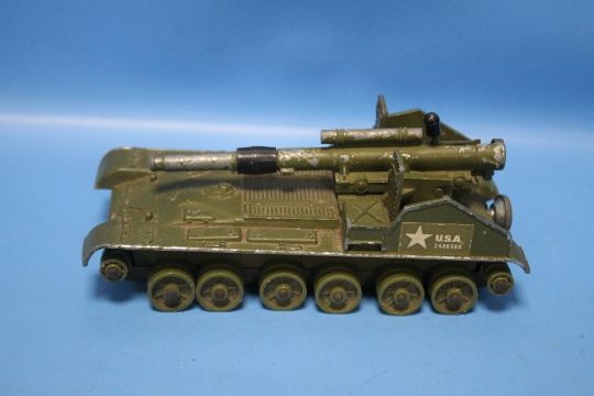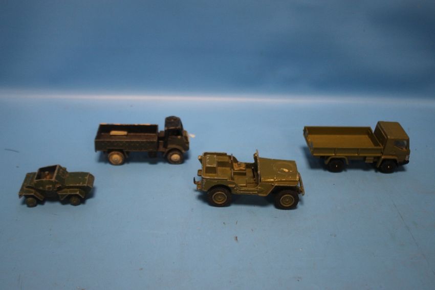 SIX DINKY MILITARY VEHICLES to include 155mm mobile gun, Alvis Scorpion and Striker, US jeep, Scout car, army wagon and open back truck