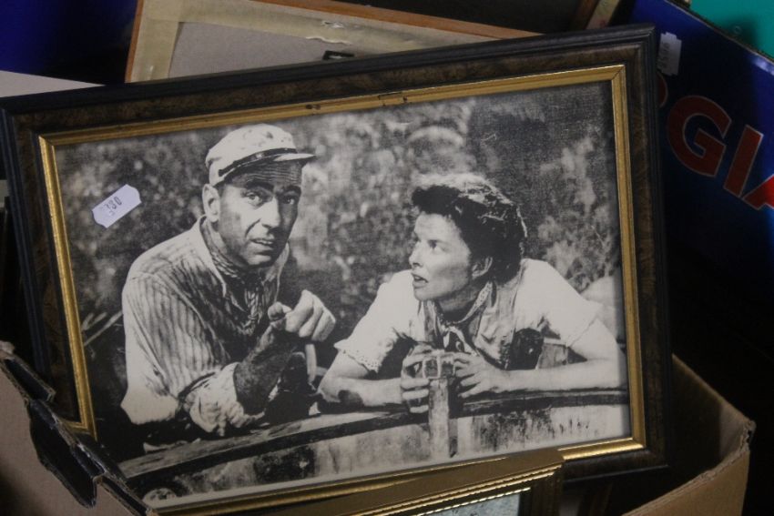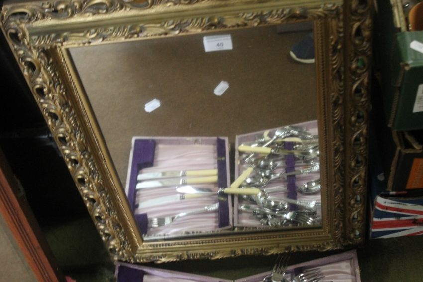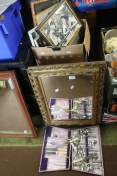 A LARGE BOX OF ASSORTED PICTURES, A BOXED CUTLERY SET, A DIGITAL PHOTO FRAME AND A GILT MIRROR, ETC.