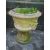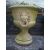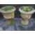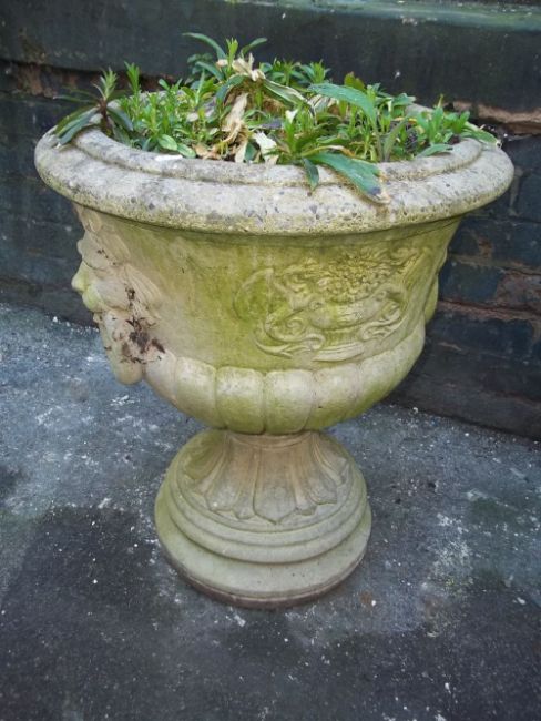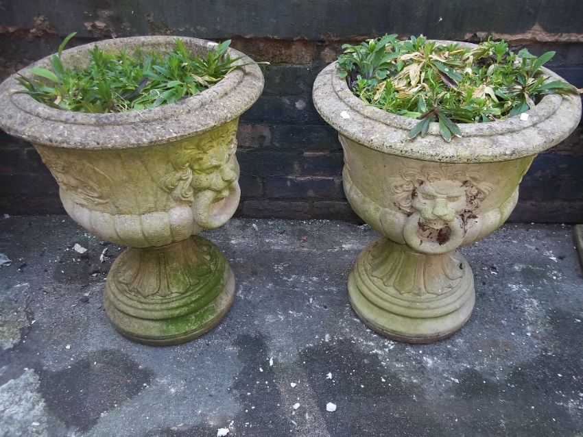 TWO LARGE RECONSTITUTED STONE PLANTERS AND STANDS/PLINTHS WITH LION'S HEAD DETAIL
