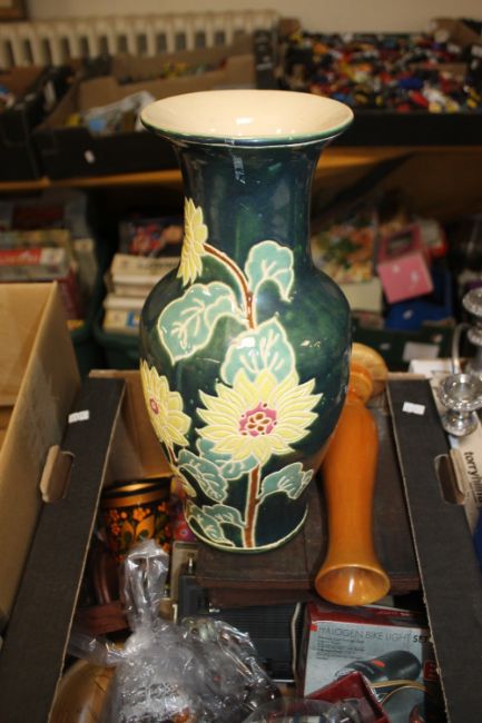 A BOX OF PLATED WARE AND A BOX OF SUNDRIES TO INCLUDE VASES, TREEN ETC.
