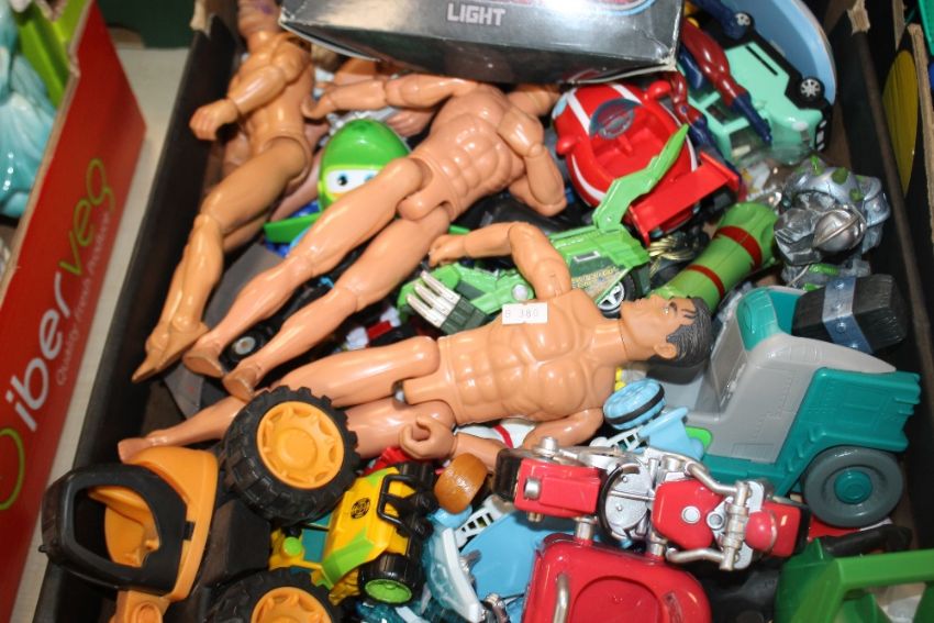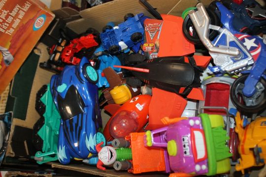 THREE BOXES OF TOYS TO INCLUDE ACTION MEN, MARVEL FIGURES, BOXED BUCKAROO GAME, AND A COLLECTION OF PLASTIC CARS AND MOTORBIKES