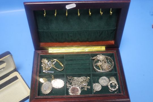 A BOX OF WHITE METAL CHAINS, BROOCHES ETC.