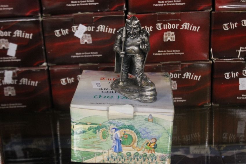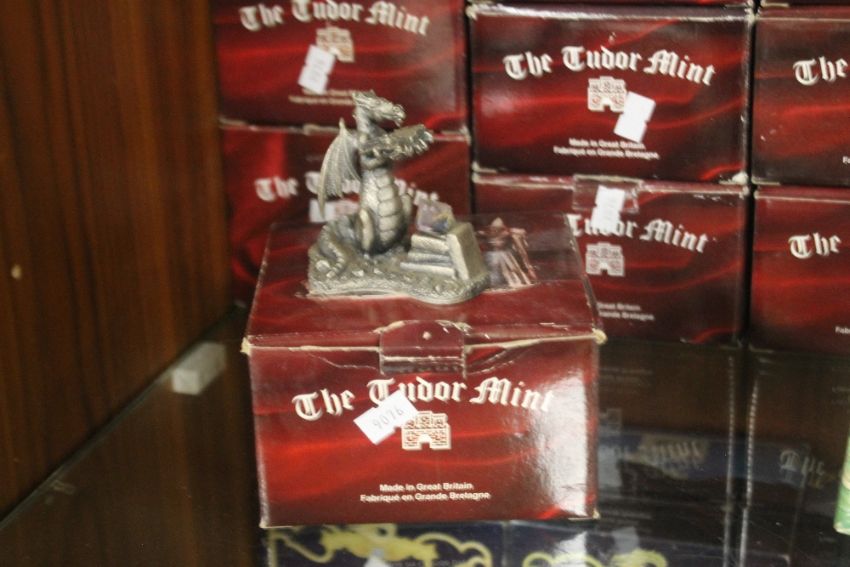 A QUANTITY OF TUDOR MINT BOXED FIGURES comprising The Minotaur, Wizard of Light, Loving Dragons, Dragon of Icextals (x2), Wizard of Winter (x2), Excalibur (x3), Dragon of Skulls, Wizard of the Lake, Spirits - Forest, The Spirited Pegasus, Merlin (x2), Sir Lancelot, The Moon Wizard, Dark Dragon, Brontosaurus, Unicorn T Box, Sorceror's Light, Dragon of Light, Cauldron of Light, Dragon of Sun, Ice Dragon, Old Father Time (x2), Jewelled Dragon, Sword Master, Earth Wizard, The Sleepy Dragon and The Hobbit (33)