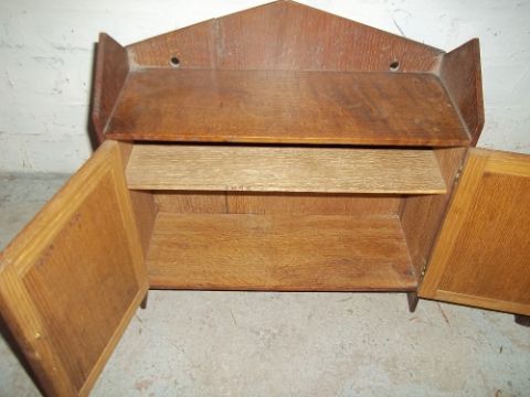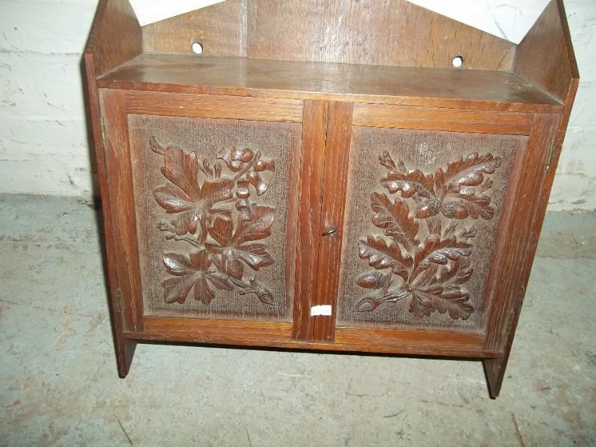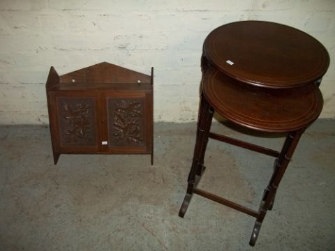 A CARVED FRONTED WALL CABINET AND A SET OF TWO TABLES