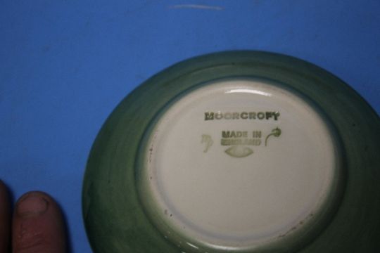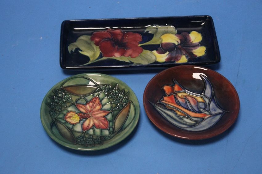 THREE MOORCROFT DISHES COMPRISING TWO PIN DISHES AND A RECTANGULAR TRAY Condition Report:  There is crazing to the glaze of the oblong dish but otherwise no chips or cracks that we can find