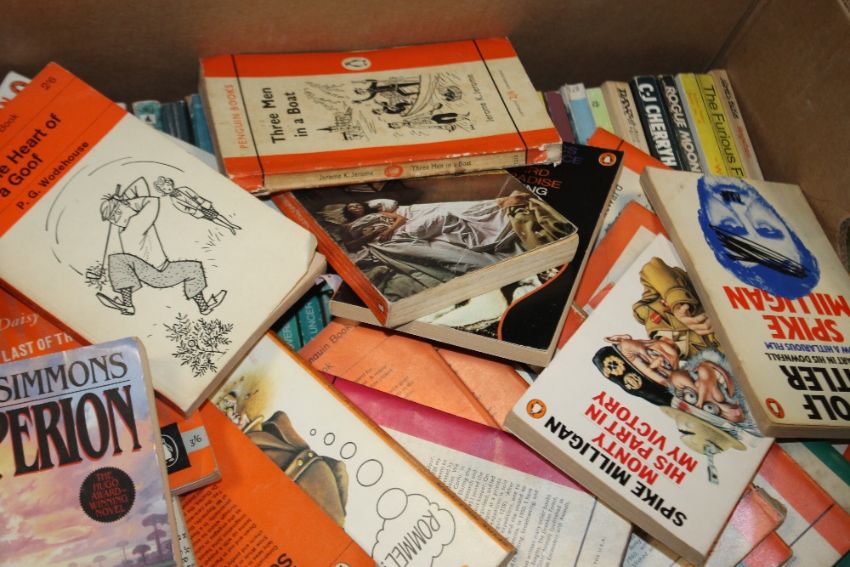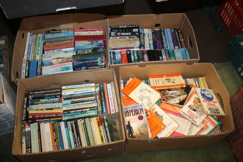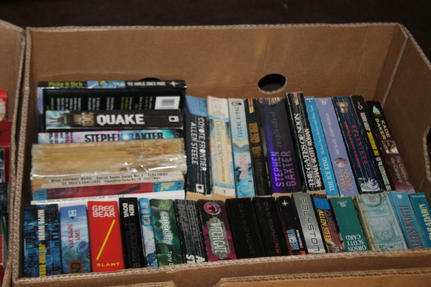 A FOLDING WICKER BOX AND TWO TRAYS OF MAINLY SCIENCE FICTION, FANTASY BOOKS