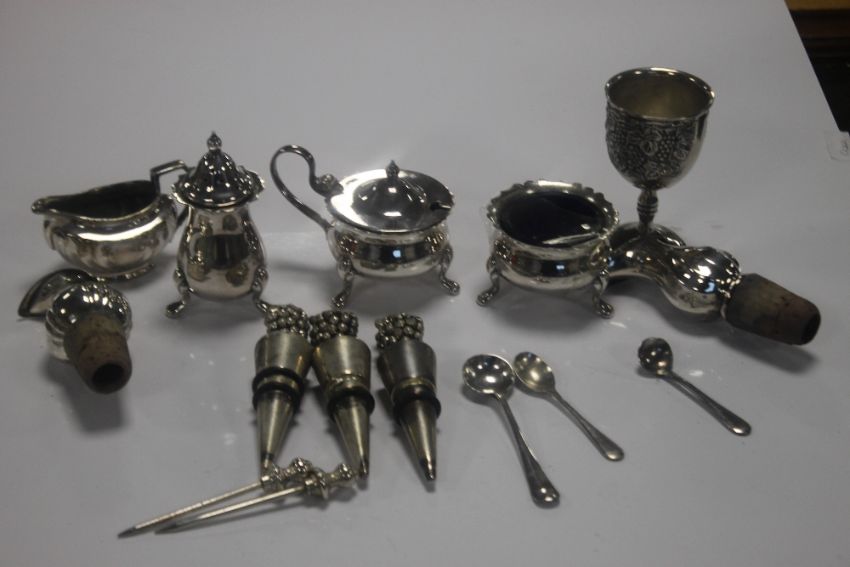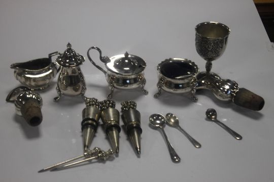 A COLLECTION OF WHITE METAL ITEMS TO INCLUDE BOTTLE STOPPERS, CRUET ETC.