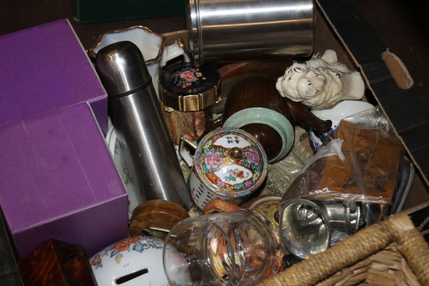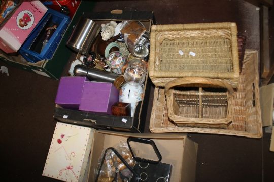 A TRAY OF SUNDRIES TO INCLUDE A SPONG VINTAGE MINCER TOGETHER WITH A COLLECTION OF WICKER BASKETS
