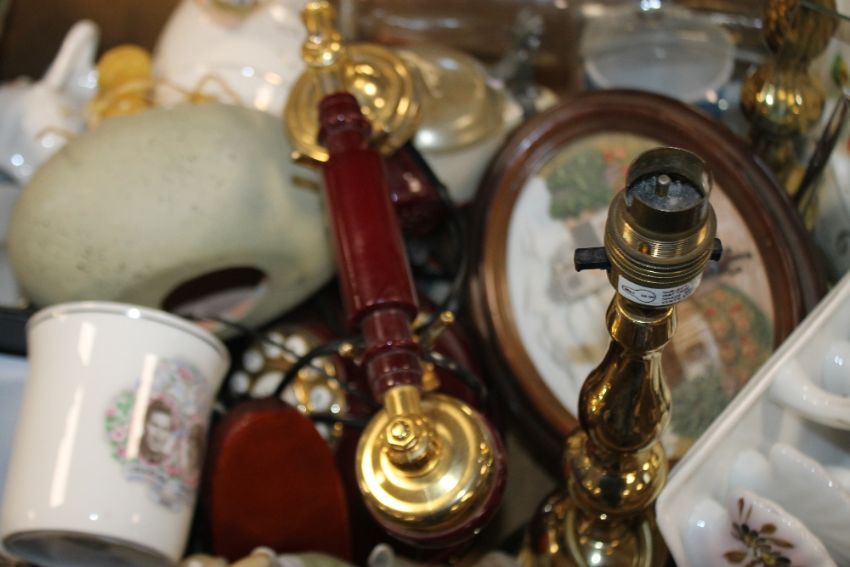 TWO TRAYS OF SUNDRIES TO INCLUDE PUSH BUTTON REPRODUCTION TELEPHONE, PAIR OF MATCHING BRASS TABLE LAMP BASES, A CLOCK, CDS INCLUDING FRED DIBNAH BOXED SET AND BOOKS