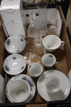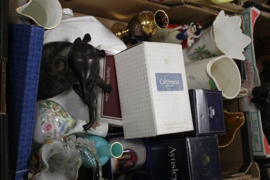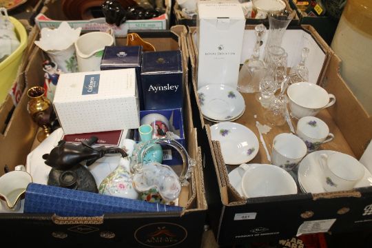 TWO BOXES OF SUNDRIES TO INCLUDE CUT GLASS, A TEA SET, ROYAL DOULTON AND AYNSLEY BOXED ITESMS, PAIR OF WOODEN ELEPHANTS, CAITHNESS GLASS, WALT DISNEY SNOW WHITE FIGURE ETC.