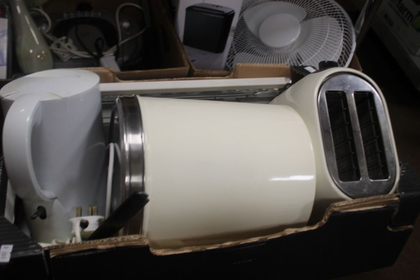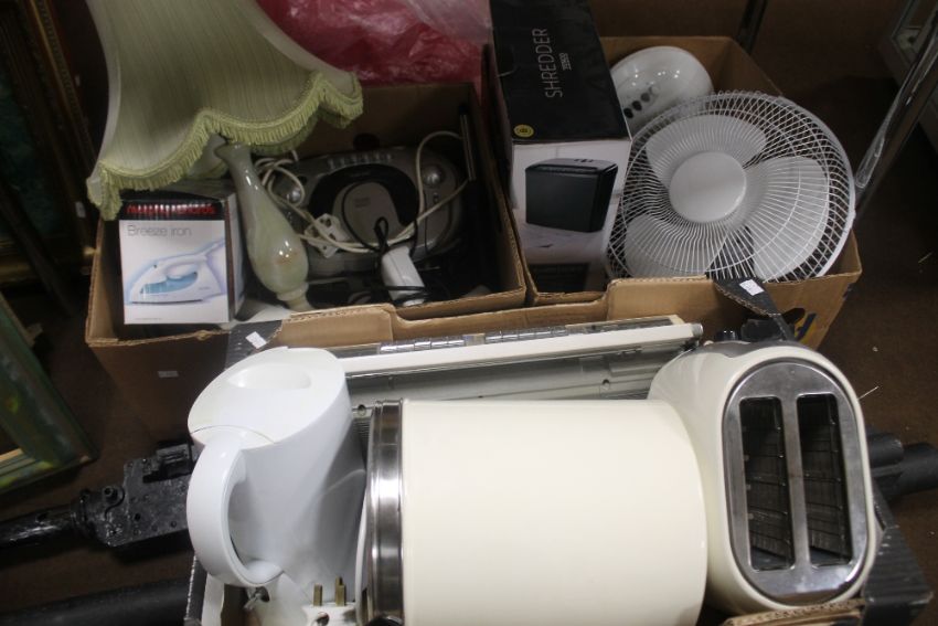 THREE BOXES OF ELECTRICAL ITEMS TO INCLUDE AN ELECTRIC FAN, SHREDDER, ALBA STEREO ETC.