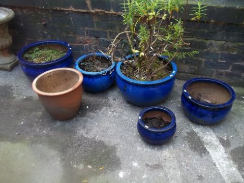 SIX GLAZED PLANT POTS, Earthenware - W 39 cm H 33 cm, crack to one side but still intactPair large Blue - W 50 cm H 30 cm chip to rim of one potPair medium blue - W 40 cm H 25 cm, crack to rim of one potSmall blue - W 27 cm H 18 cm