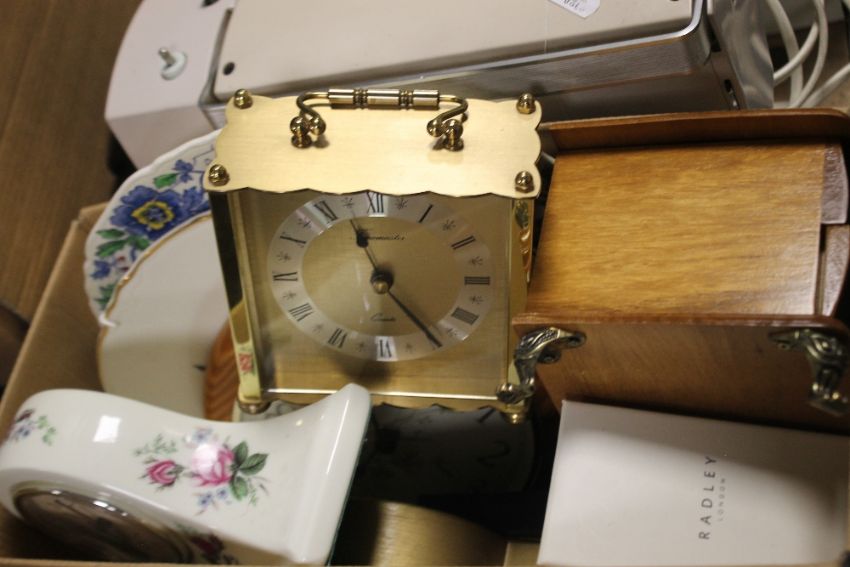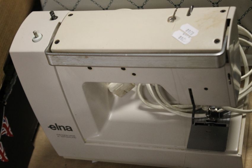 A PAIR OF ELECTRIC SEWING MACHINES, BOX CONTAINING FOUR CLOCKS AND A RADLEY WATCH AND A JEWELLERY BOX
