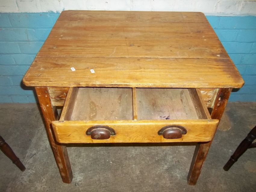 A SCRUB TOP TABLE AND SIX MATCHED CHAIRS