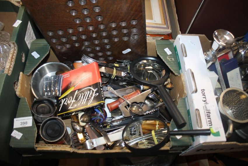 TWO TRAYS OF METALWARE TO INCLUDE TWO MAGNIFYING GLASSES ETC. (TRAYS NOT INCLUDED)
