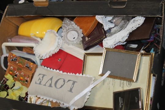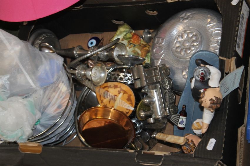 FOUR TRAYS OF SUNDRIES TO INCLUDE CERAMICS AND METALWARE