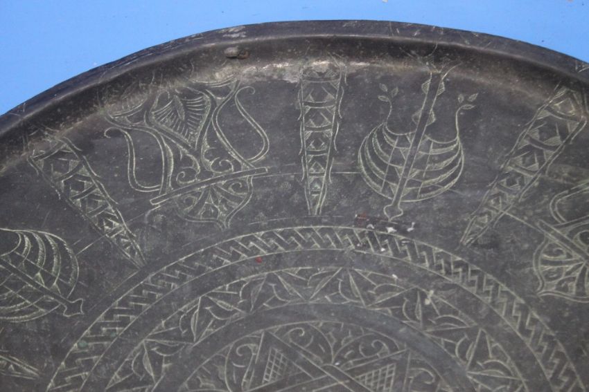 AN ANTIQUE OTTOMAN METAL TRAY DECORATED WITH TYPICAL HAND DECORATION, D 56 CM
