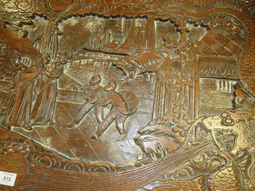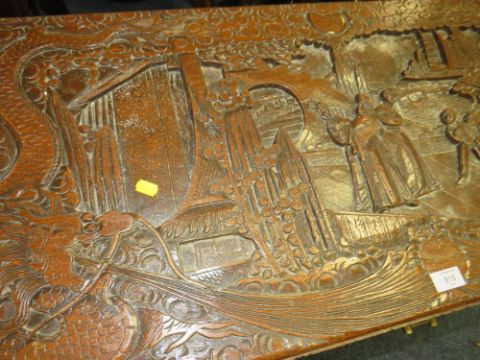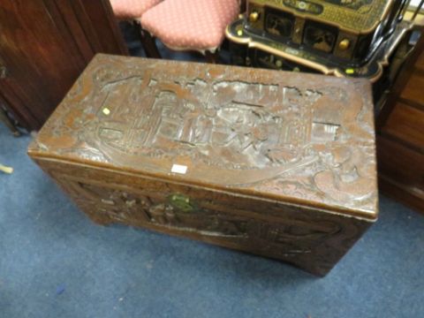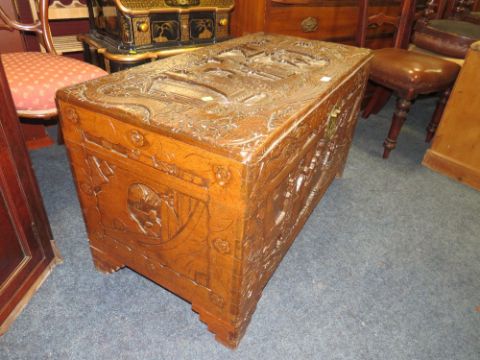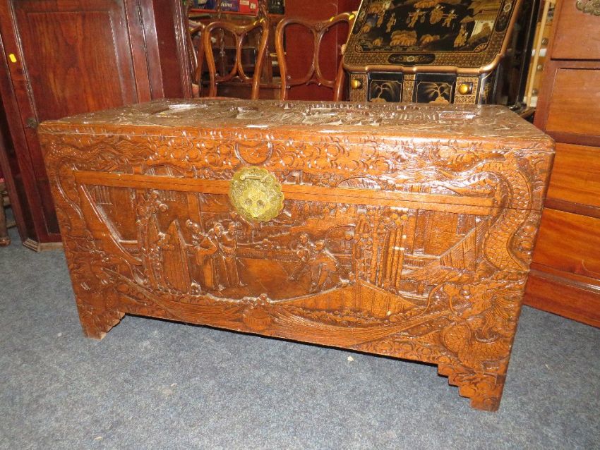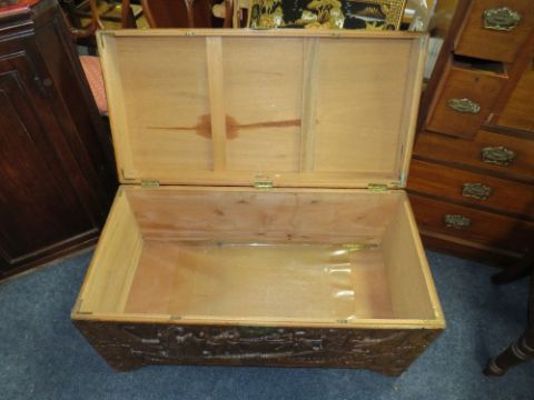 A CARVED EASTERN HARDWOOD COFFER H-56 W-101 CM S/D