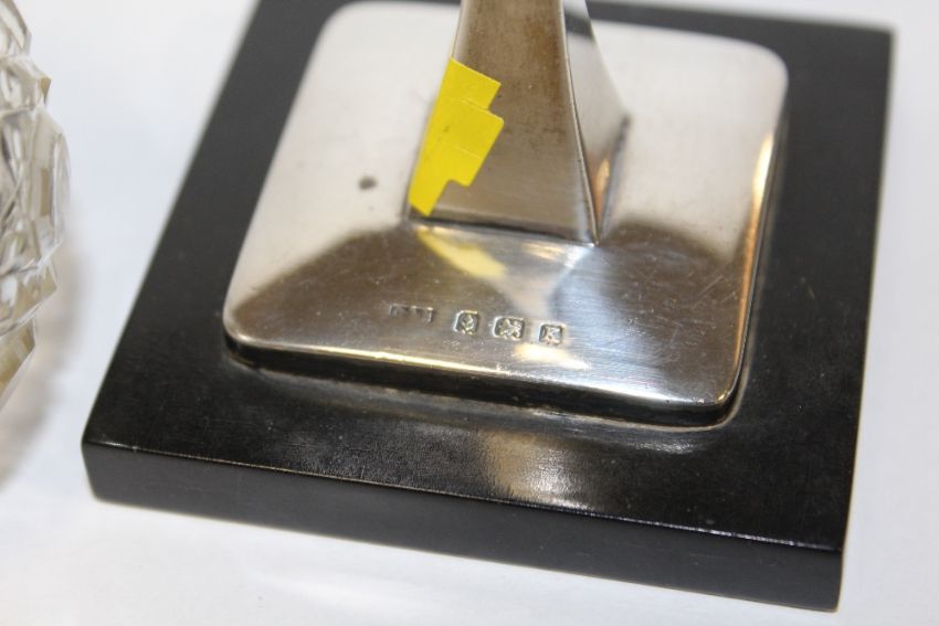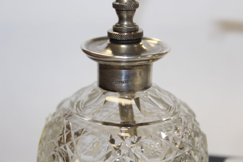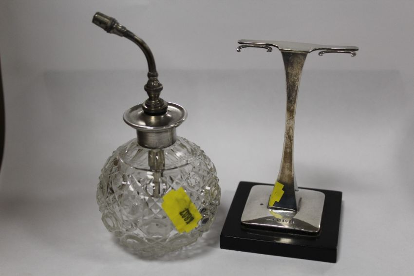 A HALLMARKED SILVER MANICURE SET STAND TOGETHER WITH A CUT GLASS PERFUME SPRAYER WITH STERLING SILVER MOUNT