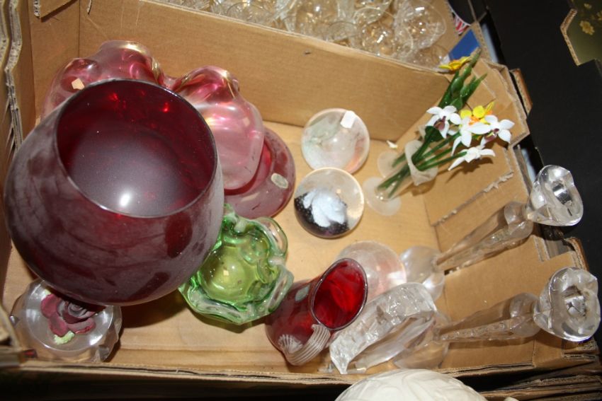 A TRAY OF STUDIO GLASSWARE ETC. TO INCLUDE PAPERWEIGHTS, GLASS FLOWERS ETC.