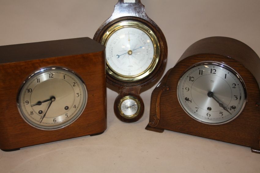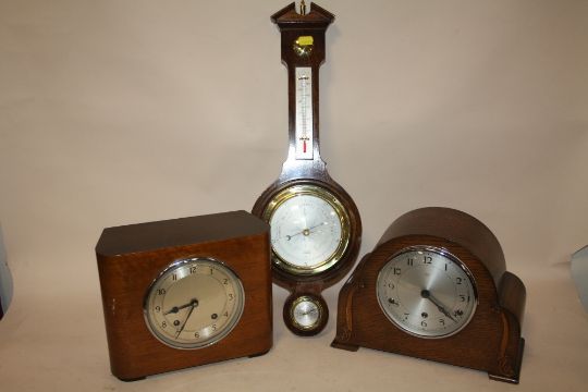 TWO VINTAGE MANTEL CLOCKS TO INCLUDE AN OAK CASED ANVIL EXAMPLE, TOGETHER WITH A REPRODUCTION MAHOGANY WALL BAROMETER (3)