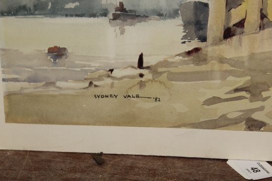SYDNEY VALE (b.1916). Thames scene at Bugsby's Reach with shipping and docks, signed and dated 1952 lower left to middle, watercolour, unframed, 35 x 51 cm
