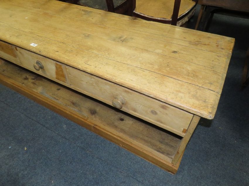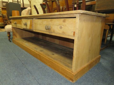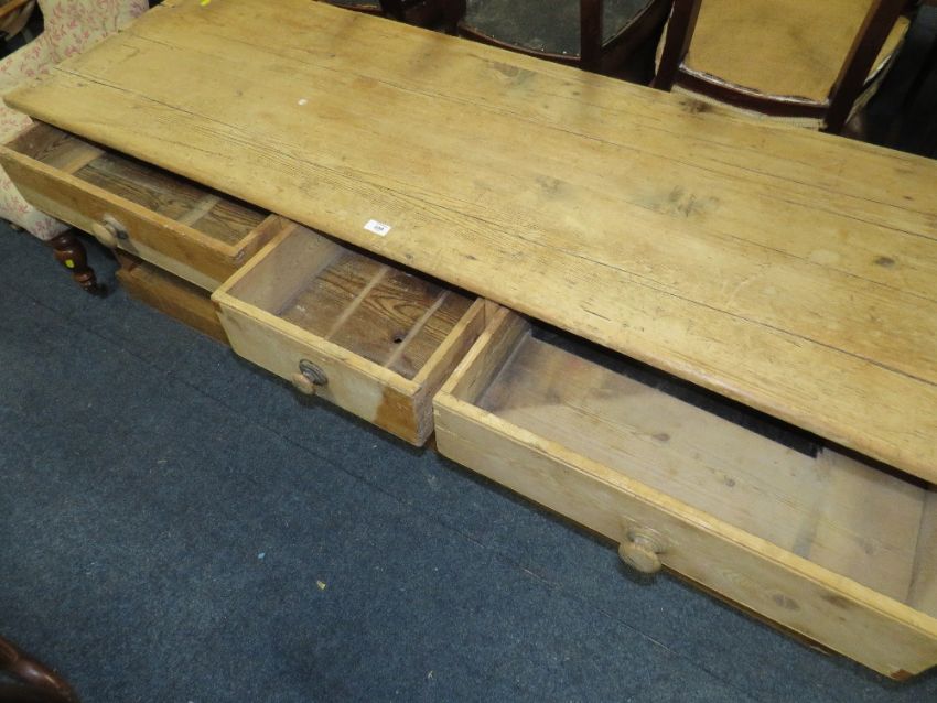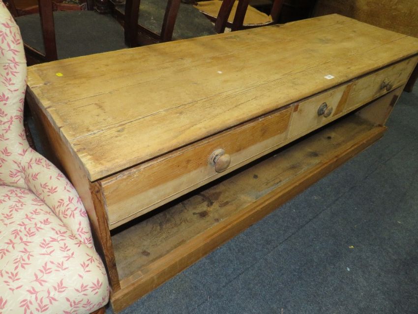 A LARGE ANTIQUE PINE LOW THREE DRAWER DRESSER H-59 W-178 D-58 CM