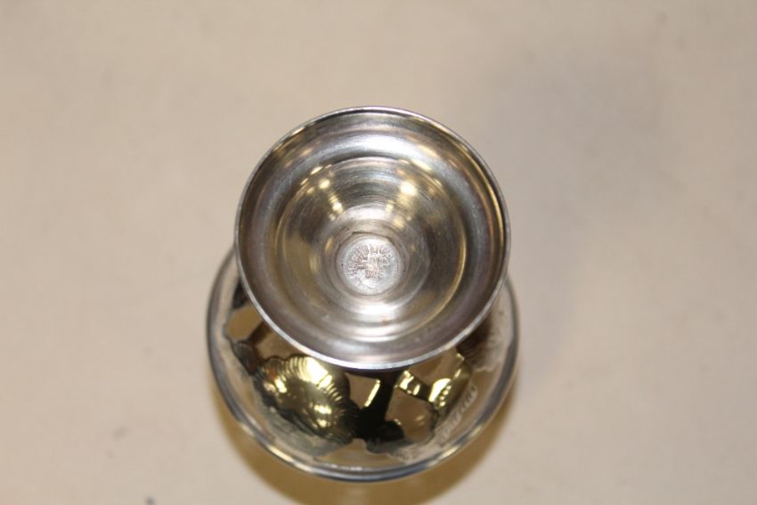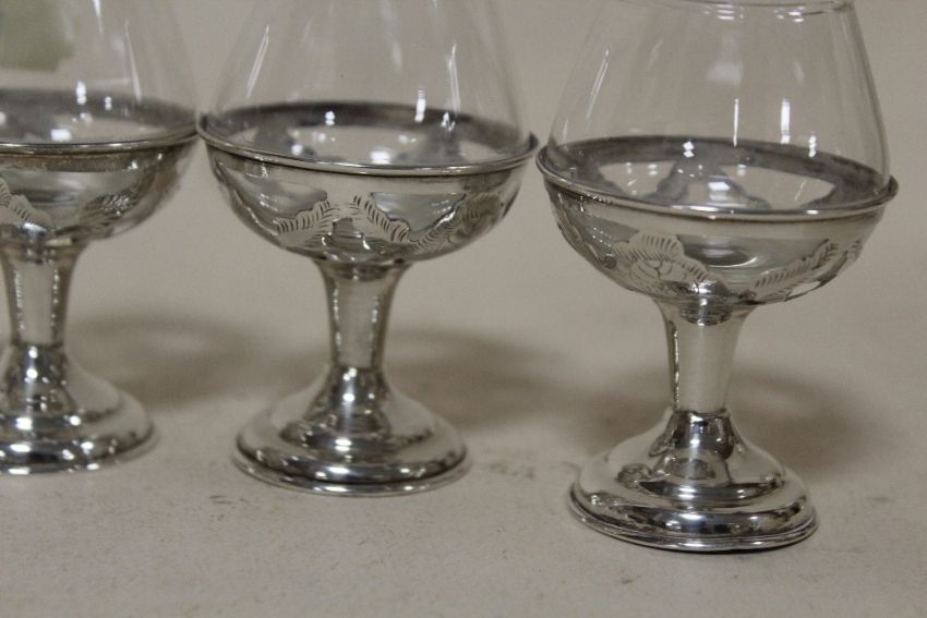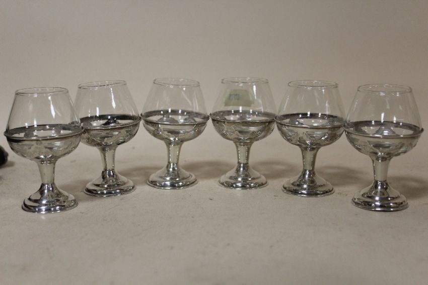 A SET OF SIX SMALL SILVER BASED DRINKING GLASSES STAMPED 925