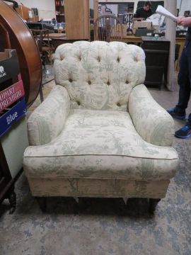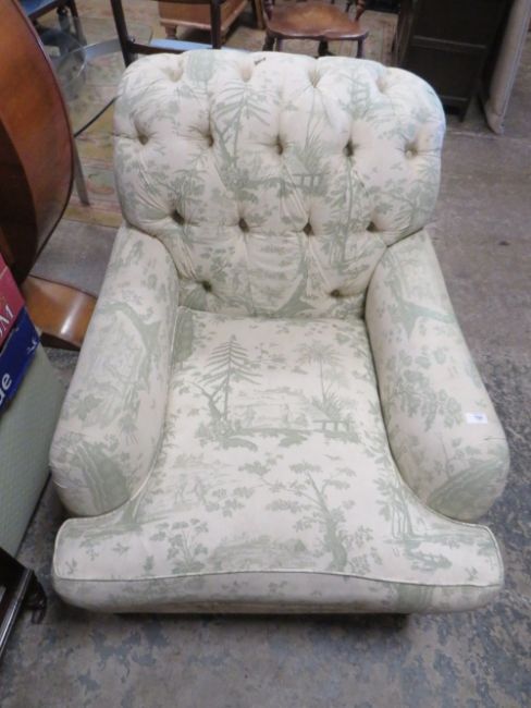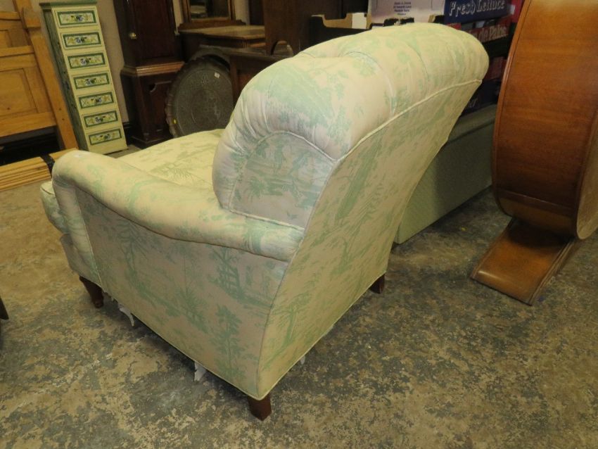 A LARGE UPHOLSTERED ARMCHAIR IN THE HOWARD AND SONS STYLE