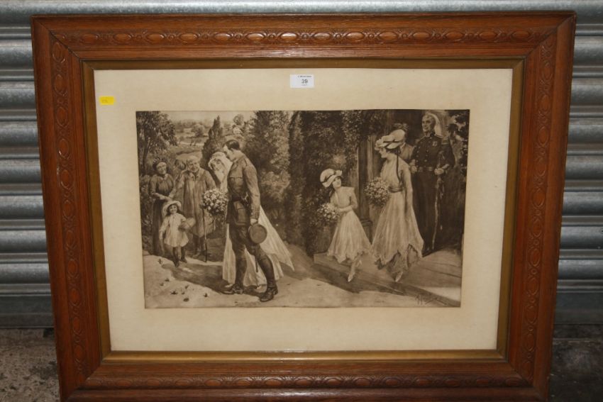A VINTAGE OAK FRAMED BLACK AND WHITE PRINT OF A MILITARY WEDDING SCENE BY A PEARSE - OVERALL SIZE INC FRAME 85.5 CM BY 68 CM