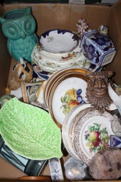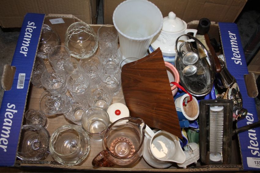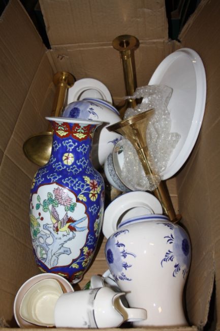 A LARGE QUANTITY OF CERAMICS AND GLASSWARE TO INCLUDE A MODERN ORIENTAL STYLE VASE, BRASS CANDLESTICKS, CUT GLASS ETC. (3 BOXES)
