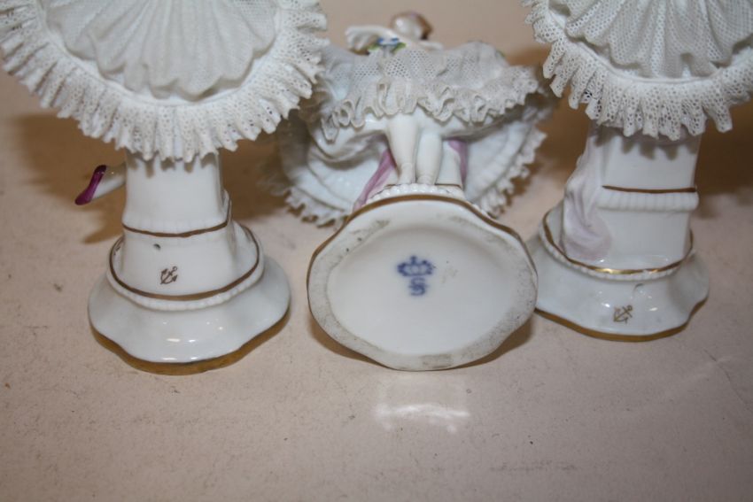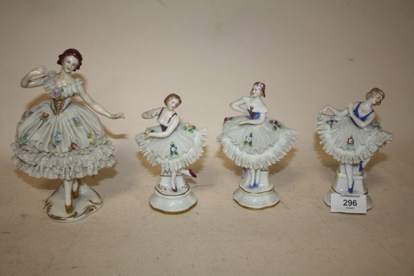 THREE CONTINENTAL STYLE BALLERINA FIGURES WITH GOLD ANCHOR STAMPS TO REVERSE TOGETHER WITH A LARGER SIMILAR GERMAN EXAMPLE (4)